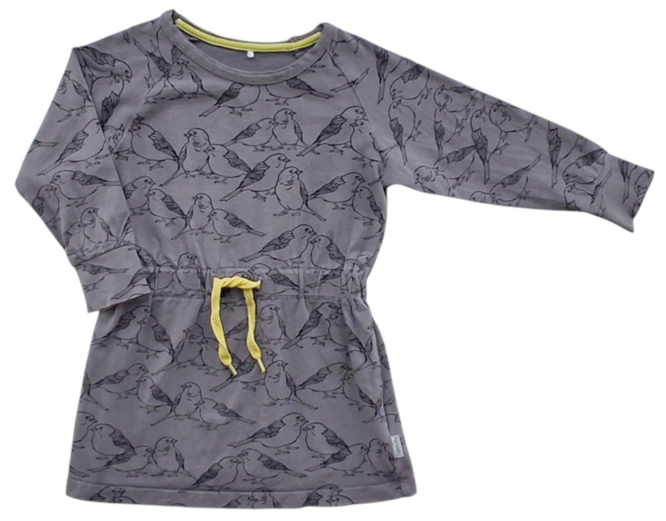 Name it grå langærmet kjole str. 80 med tryk af små fugle og med elastik og bindebånd i taljen.