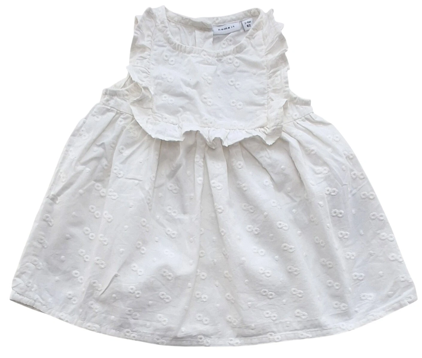 Name it hvid ærmeløs sommerkjole str. 62 med hvide blomster broderier over det hele, flæsekant på forsiden og tre knapper i ryggen.