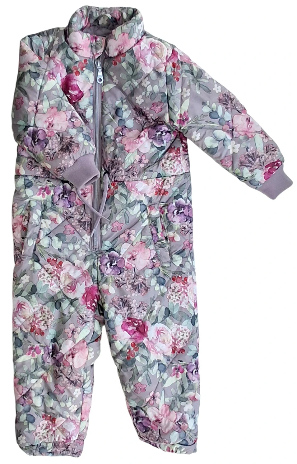 Name it lys lilla blomstret termoheldragt str. 80 med to lommer, bindebånd i taljen og med en lynlås ned foran.