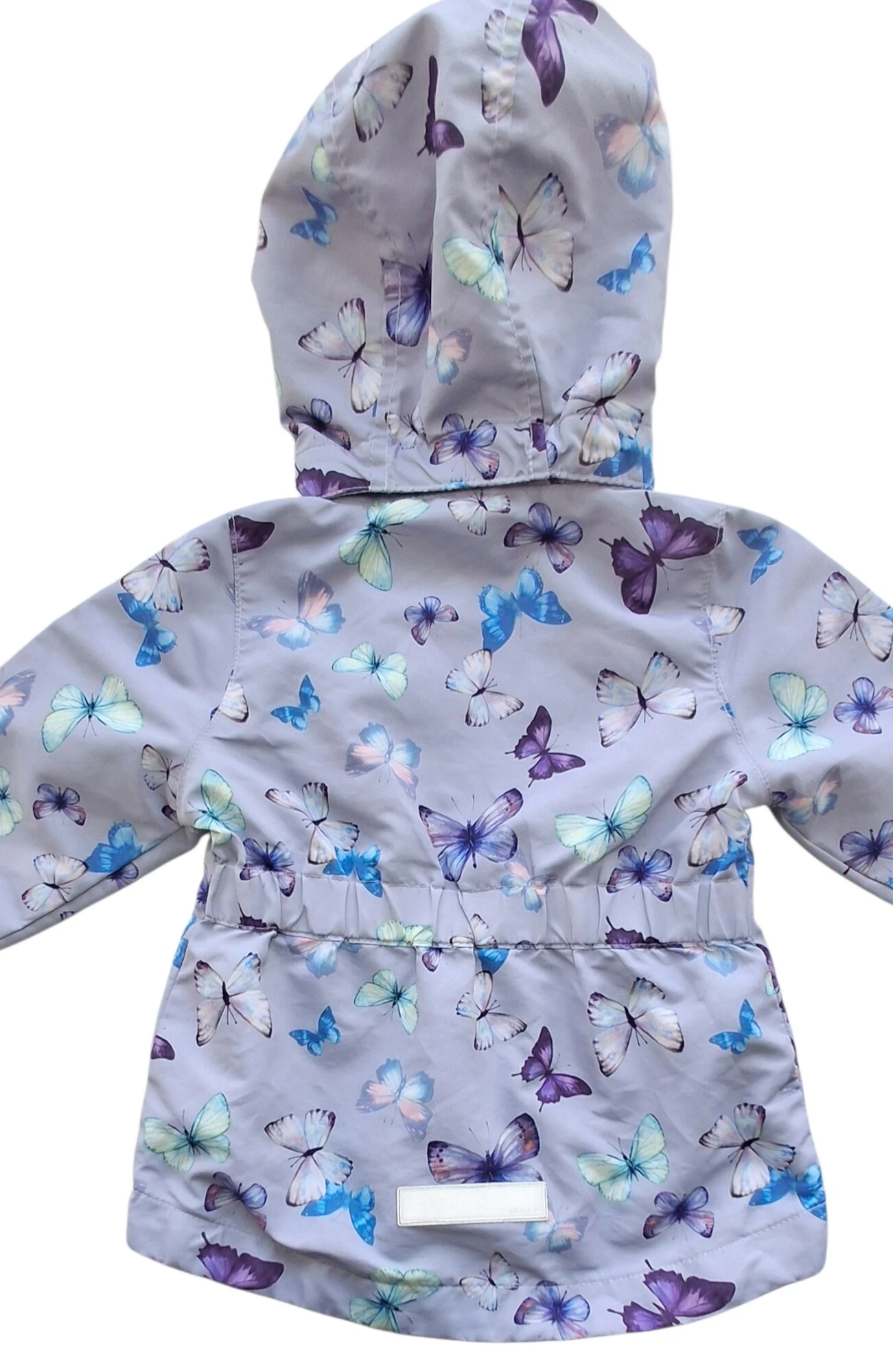 Name it lyslilla sommerjakke str. 80 med tryk af sommerfugle, rib i ærmerne, to lommer og en lynlås ned foran. Obs der er en plet på indersiden, se billede.