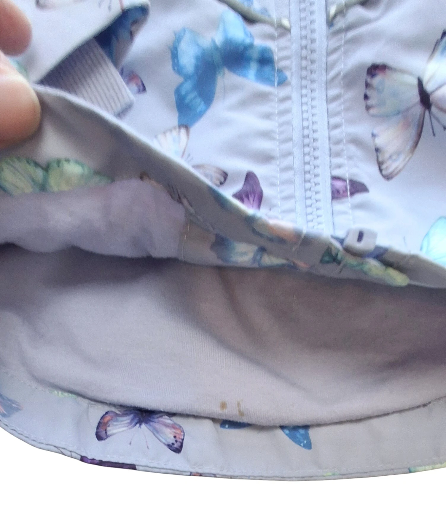 Name it lyslilla sommerjakke str. 80 med tryk af sommerfugle, rib i ærmerne, to lommer og en lynlås ned foran. Obs der er en plet på indersiden, se billede.