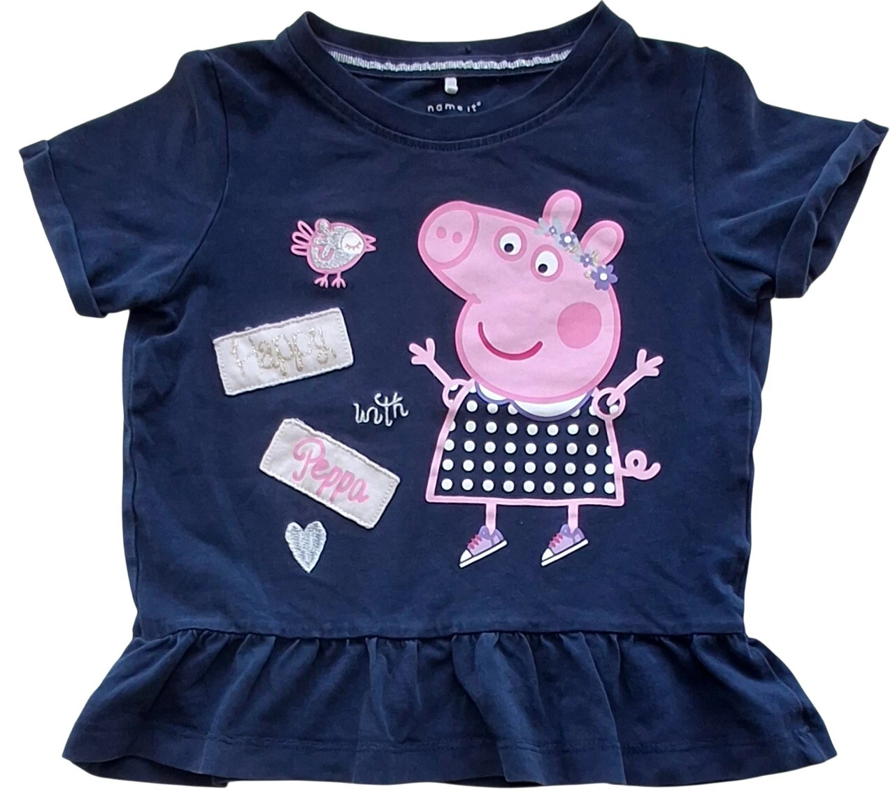 Name it mørkeblå kortærmet bluse str. 98 med et fint Gurli Gris tryk på forsiden og med en flæsekant nederst på blusen.