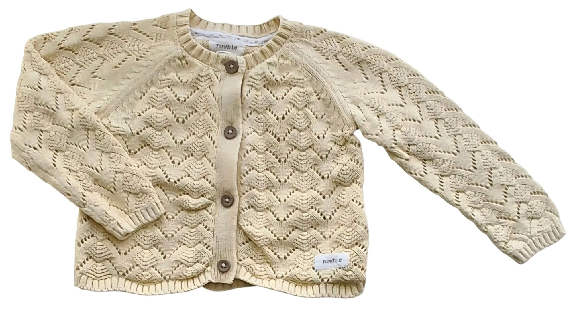 Newbie lysegul finstrikket langærmet trøje str. 80 med et flot strikket mønster og med fine knapper ned foran. 100% bomuld.