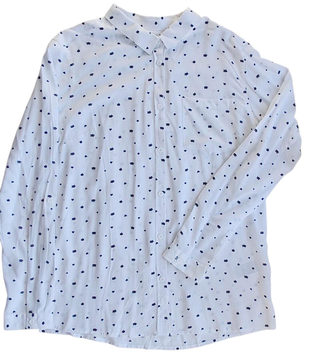 Ny Cool club hvid langærmet skjorte str. 164 cm med sort tryk af små hjerter, kattehoveder og æbler. Skjorten har en krave og knapper ned foran. 100% viscose.