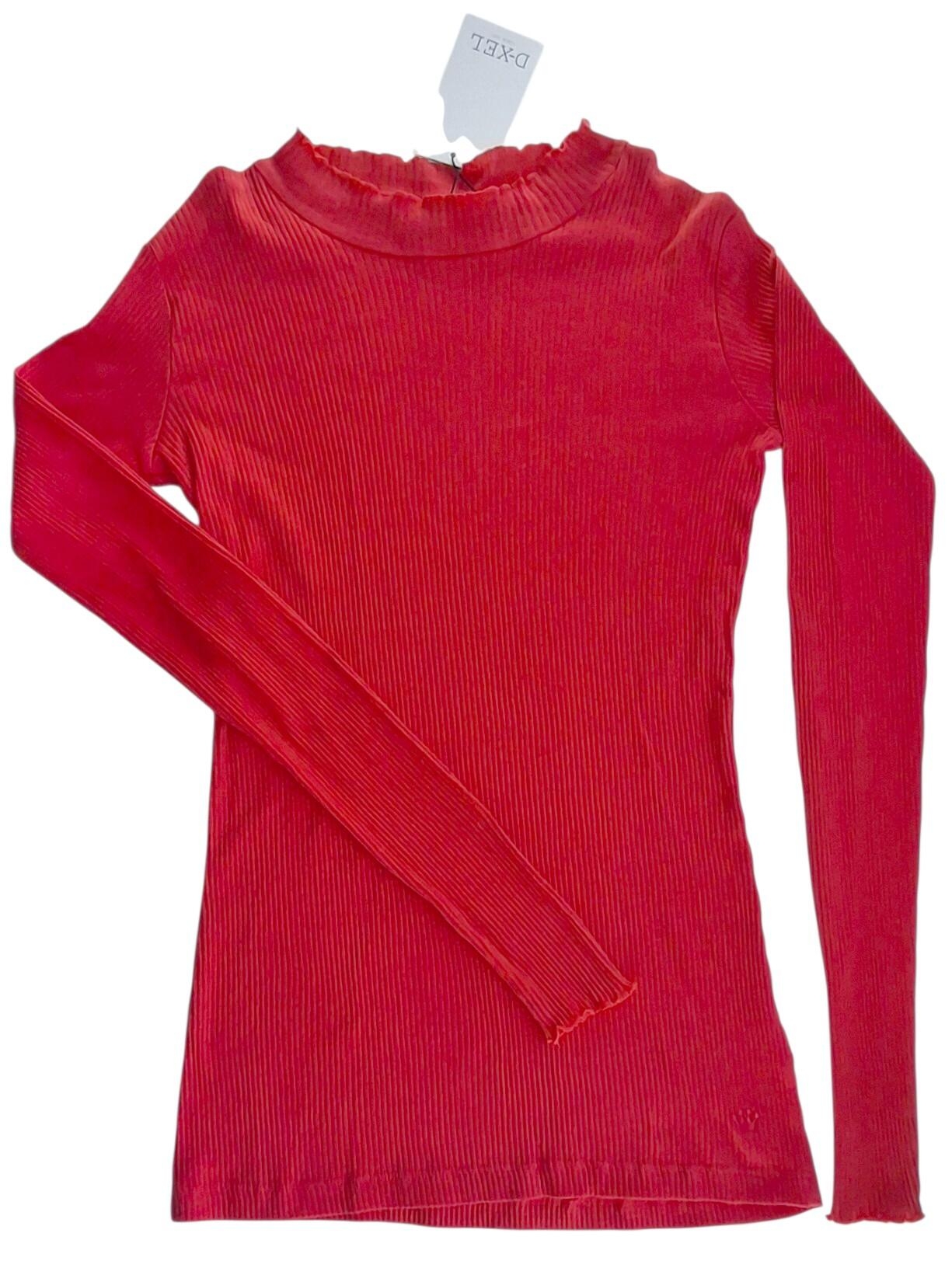 Ny D-XEL rød langærmet rib bluse str. 16 år med bølgede kanter i ærmerne og i halsudskæringen. 100% bomuld.