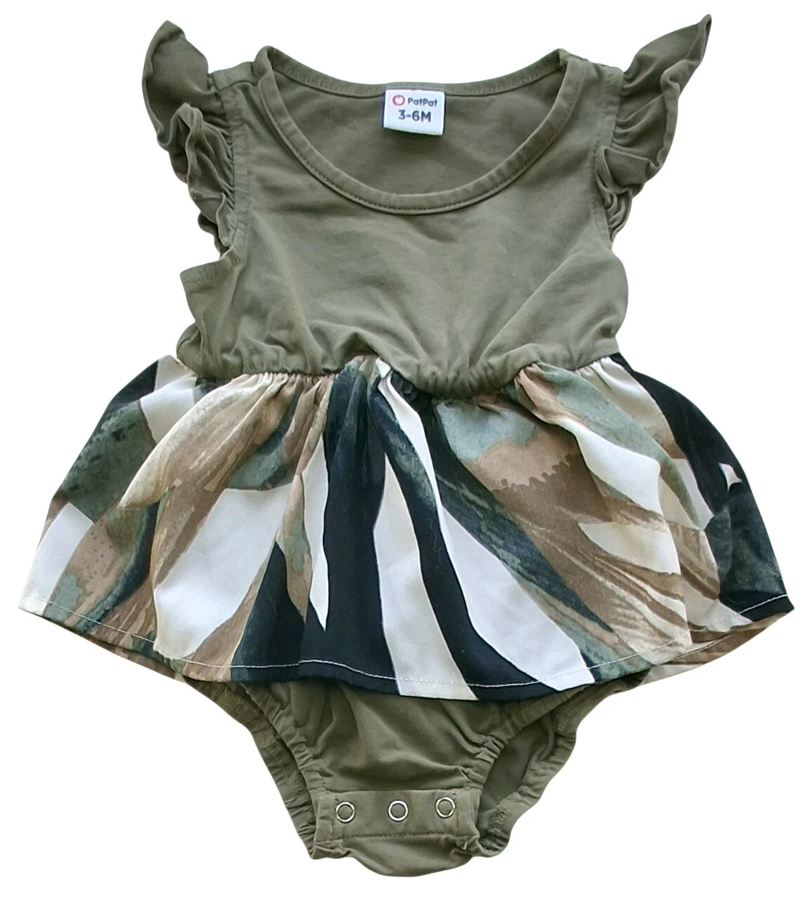 Patpat armygrøn mønstret ærmeløs bodykjole str. 3-6 M med flæse over skuldrene og med elastik i benene.