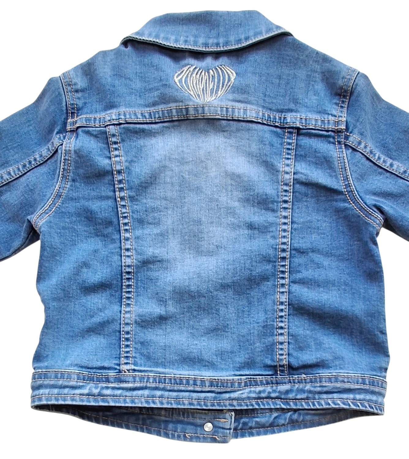 Pomp de lux blå langærmet denimjakke str. 128 med to brystlommer hvor den ene klap er pyntet med pailetter, krave og med knapper ned foran.