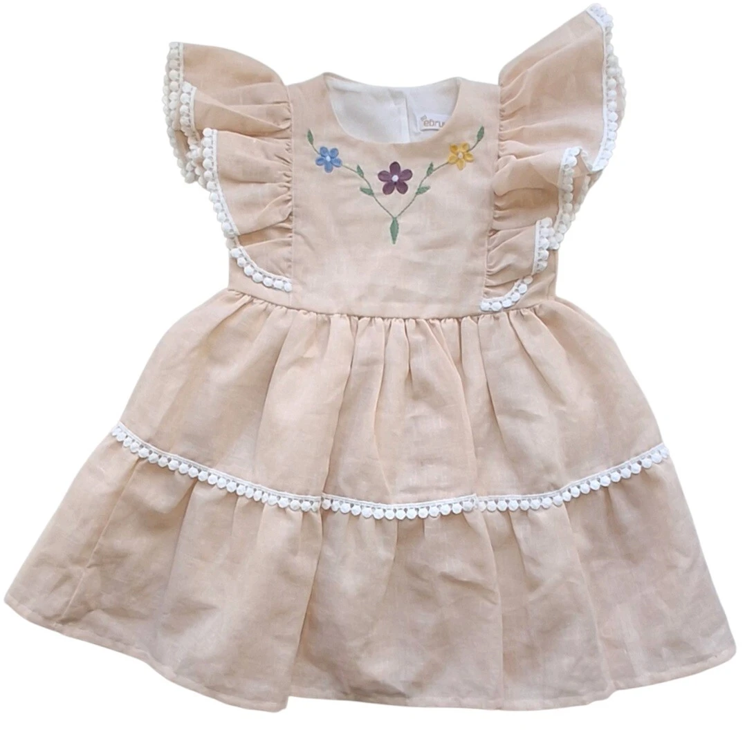 Sg ebruli lys ferskenfarvet kortærmet kjole str. 98 med to lag skørt, små vinge ærmer, sødt blomsterbroderi på forsiden og med tre knapper i ryggen.