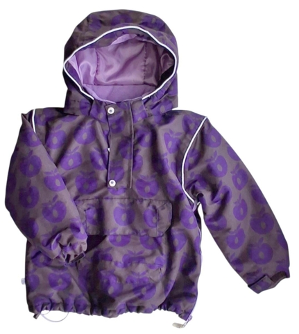 Småfolk lilla tyk vinterjakke str. 3-4 år med tryk af æbler, hætte, stor lomme på forsiden og med varmt fleece for.