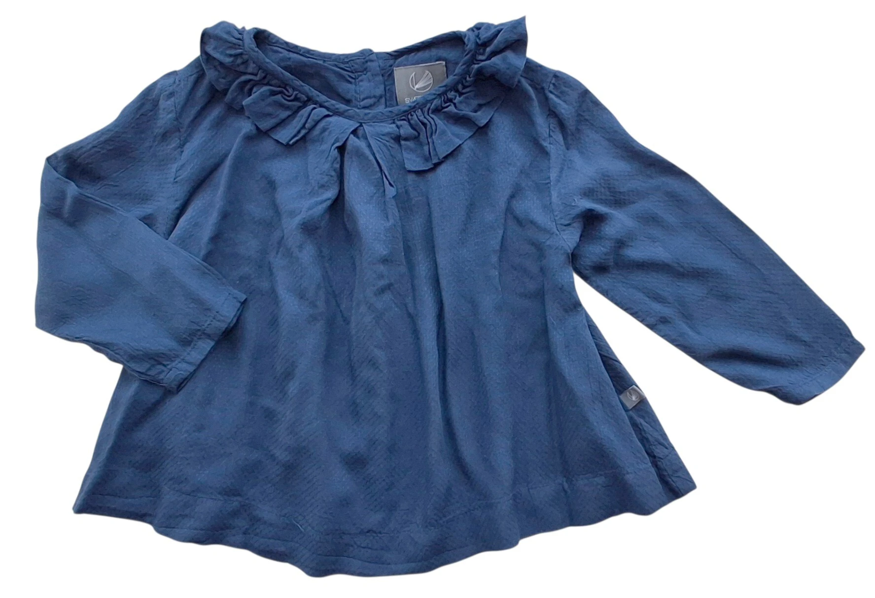 Svært Fint tynd langærmet bluse str. 92 med små bitte prikker i stoffet, krave og tre knapper i nakken. 80% bomuld, 20% viscose.