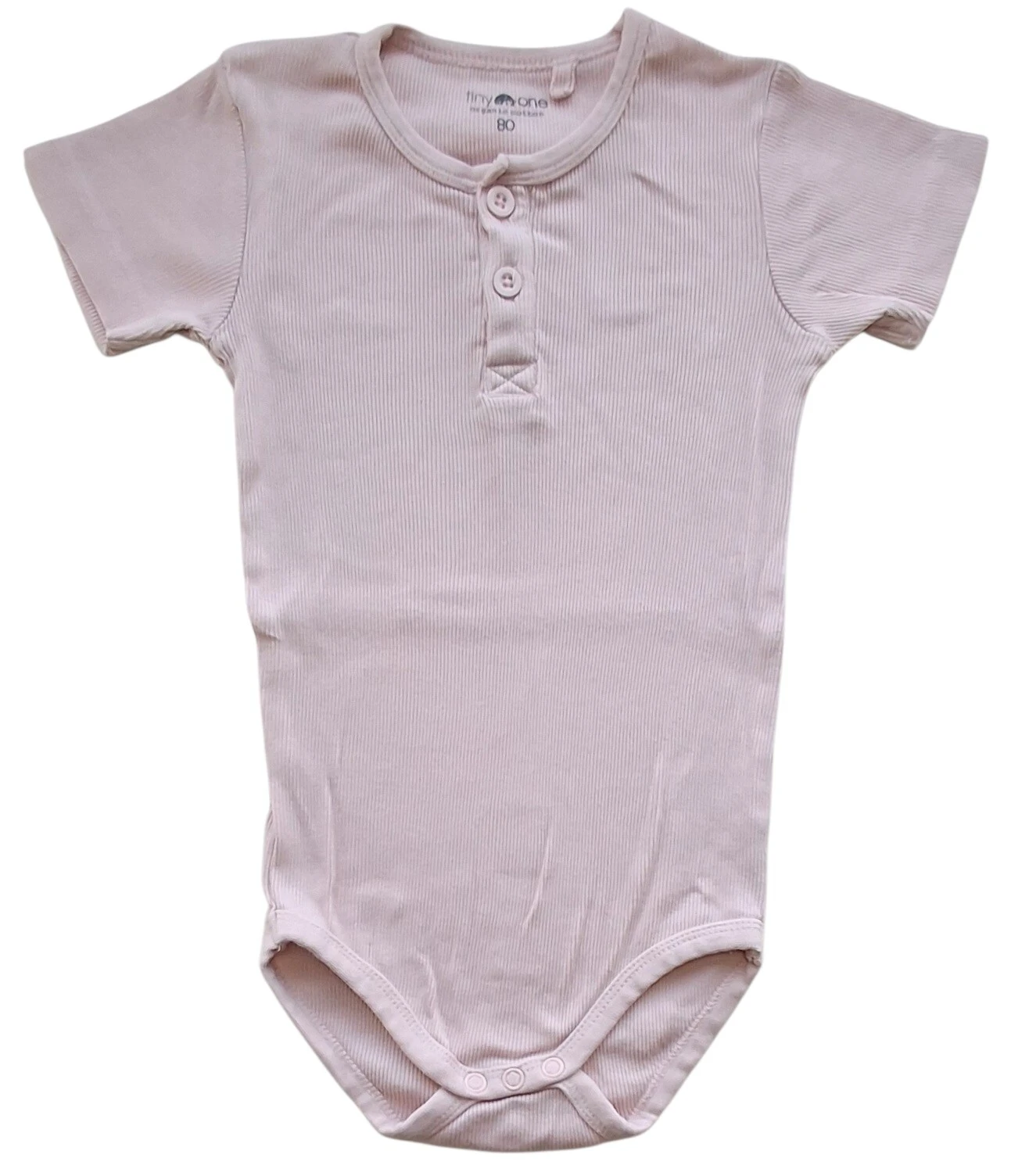 Tiny one lyserød kortærmet rib body str. 80 med to knapper i stolpelukning ned foran. 100% bomuld.