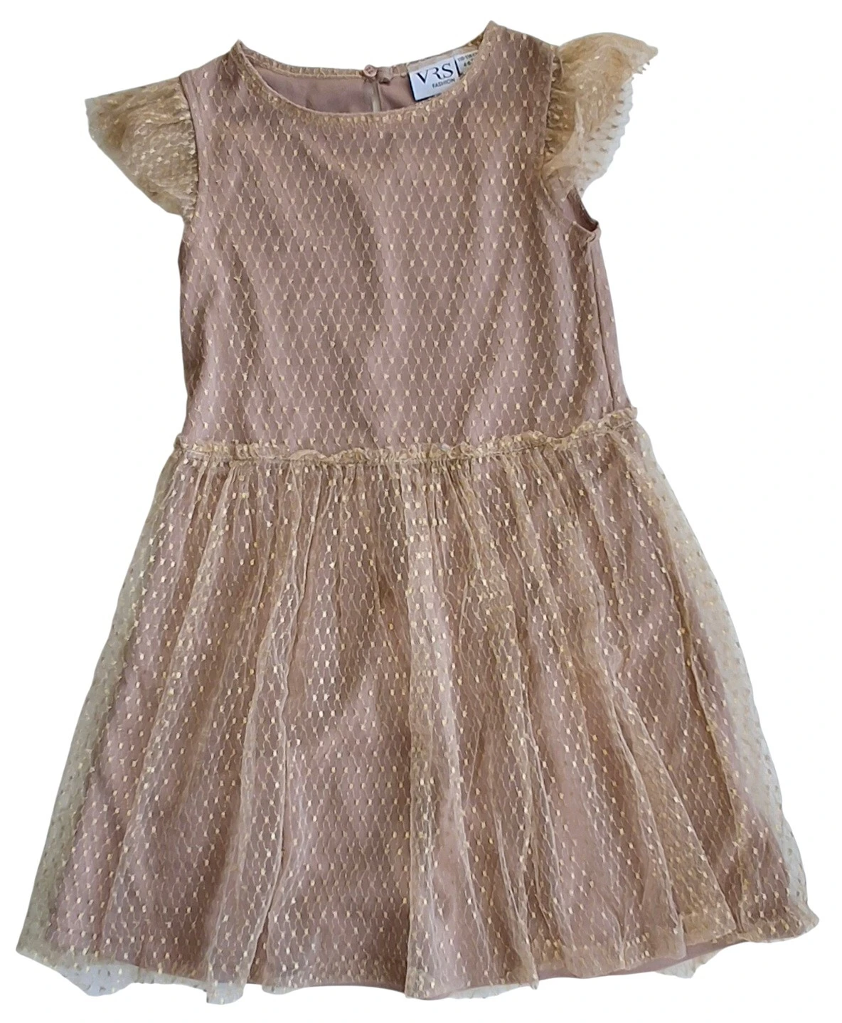 VRS lysebrun kortærmet kjole str. 110-116 med et tyndt lag tyl med guldtryk yderst, elastik i taljen og en knap i nakke.