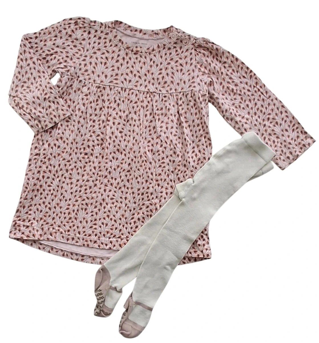 VRS rosa langærmet kjole og beige strømpebukser str.74. Kjolen er tynd og har et fint mønster af blomster, og strømpebukserne er fra Noa Noa.