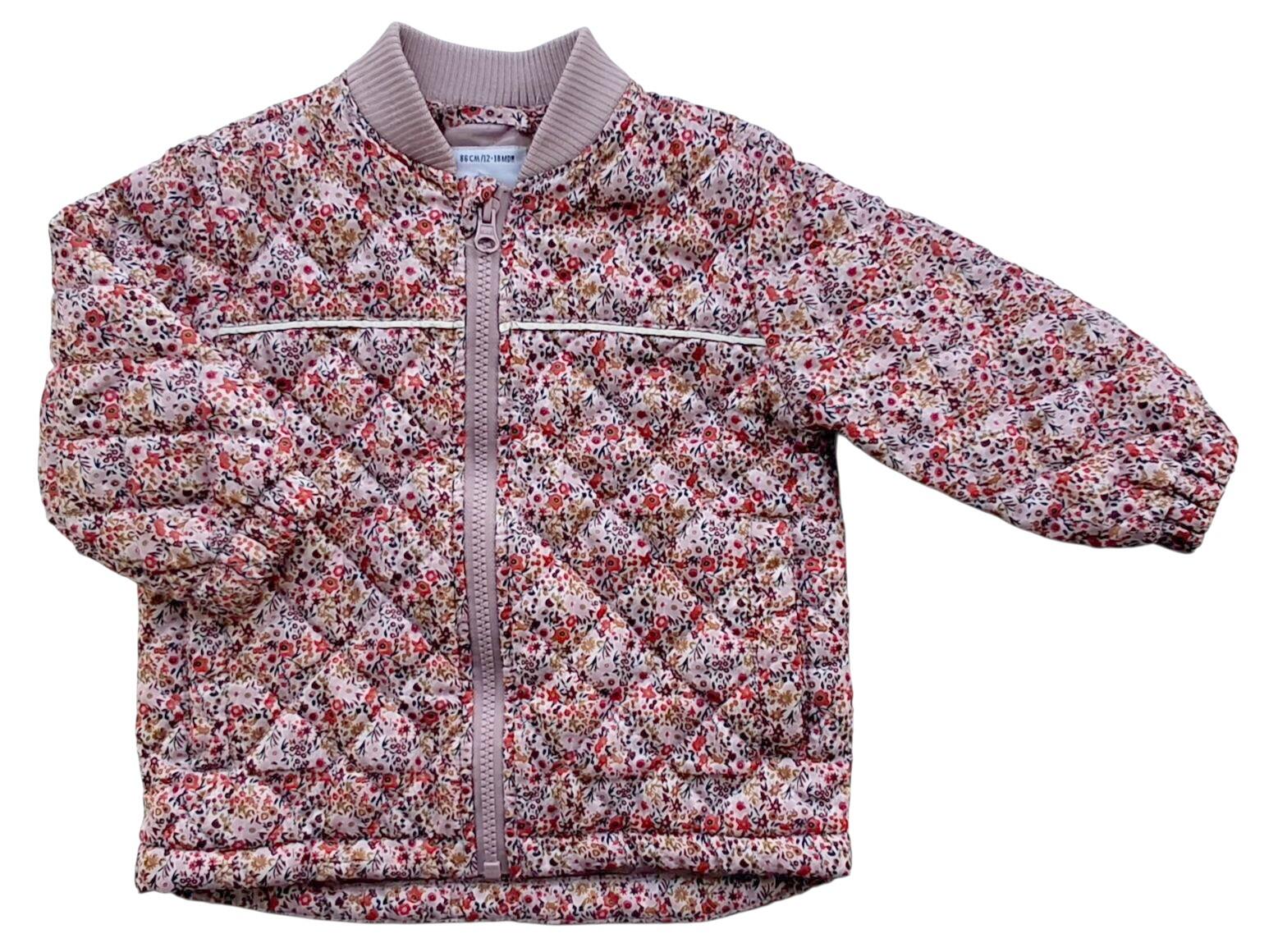 VRS rosa småblomstret termojakke str. 86 med elastikker i ærmerne, rosa rib kant i halsen og med en lynlås ned foran.