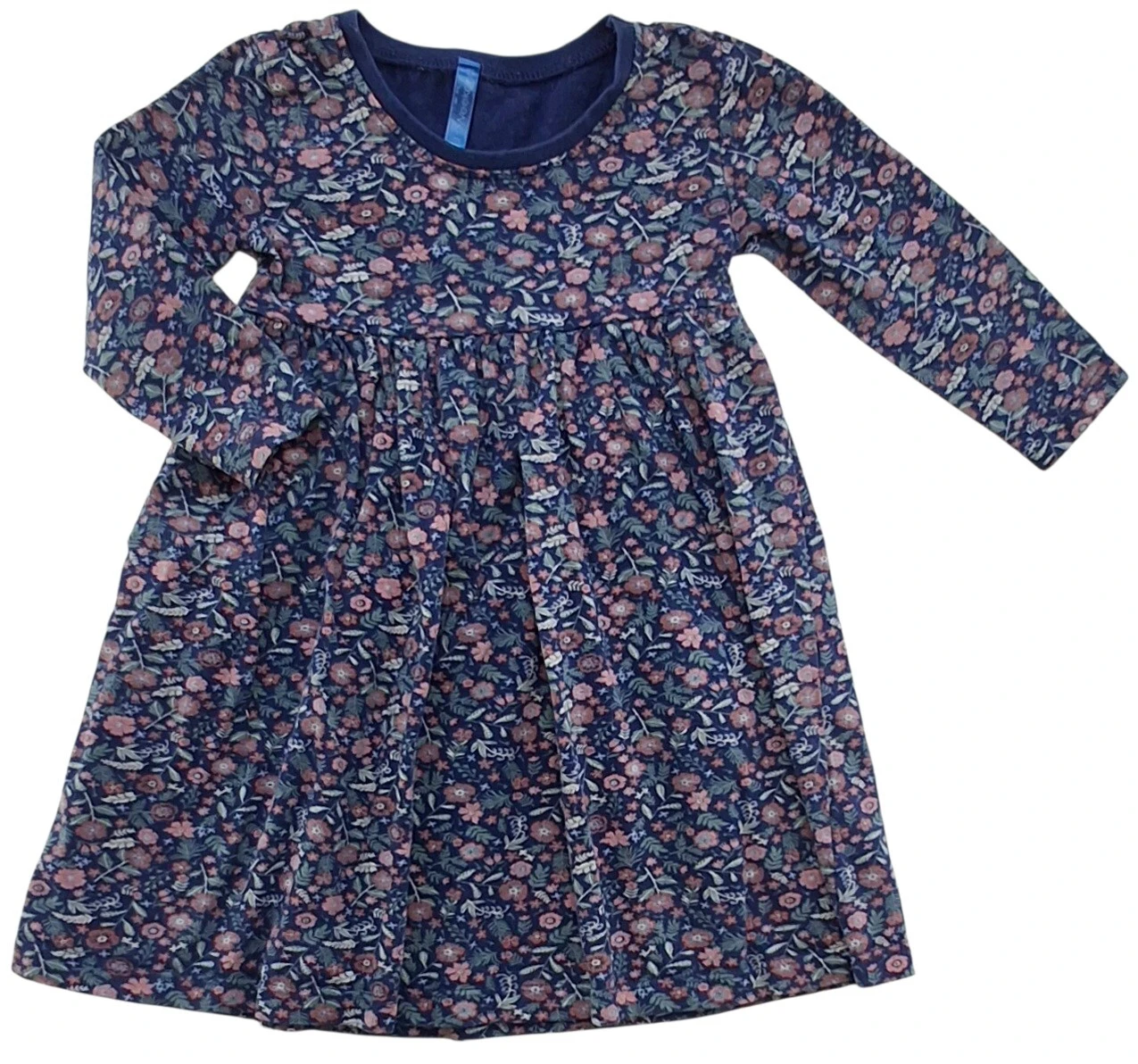 Weekend mørkeblå blomstret langærmet kjole str.1 år (80-86) med mange læg i talen og en rund hals. 100% bomuld.