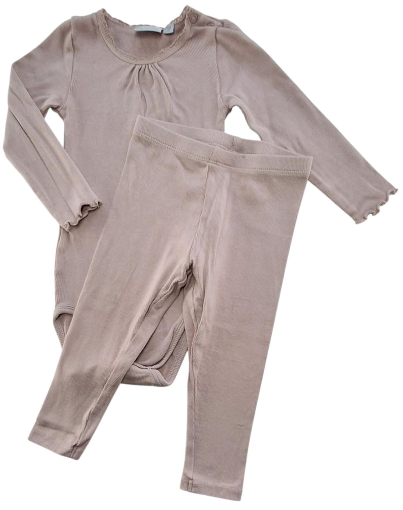Wheat rosa body og bukser rib sæt str. 80. Bukserne har elastik i taljen, og bodyen er langærmet med bølgede kanter i ærmerne, læg ved halsudskæringen og med to trykknapper på skulderen.