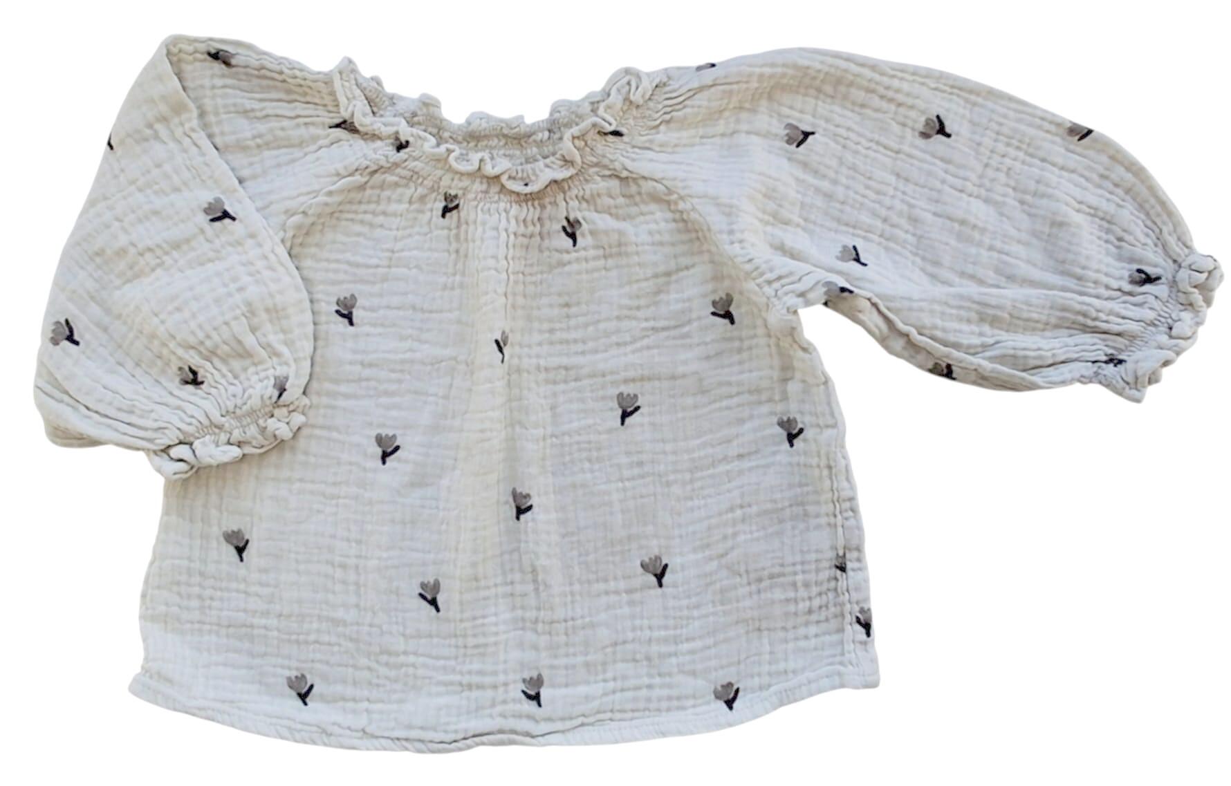 Zara råhvid langærmet bluse str. 92 med tryk af blomster, elastik i ærmer og halsudskæring og med god vidde. 100% bomuld.