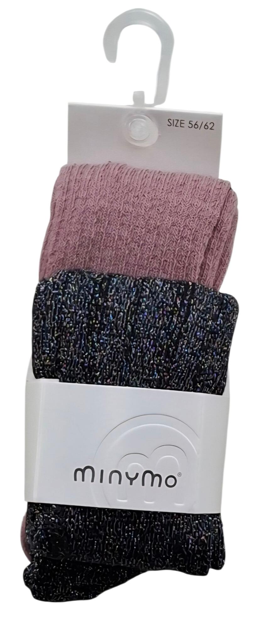 Nye Minymo 2-pak strømpebukser. Det ene par er sorte med sølvglimmer, og det andet par er mørk rosa.