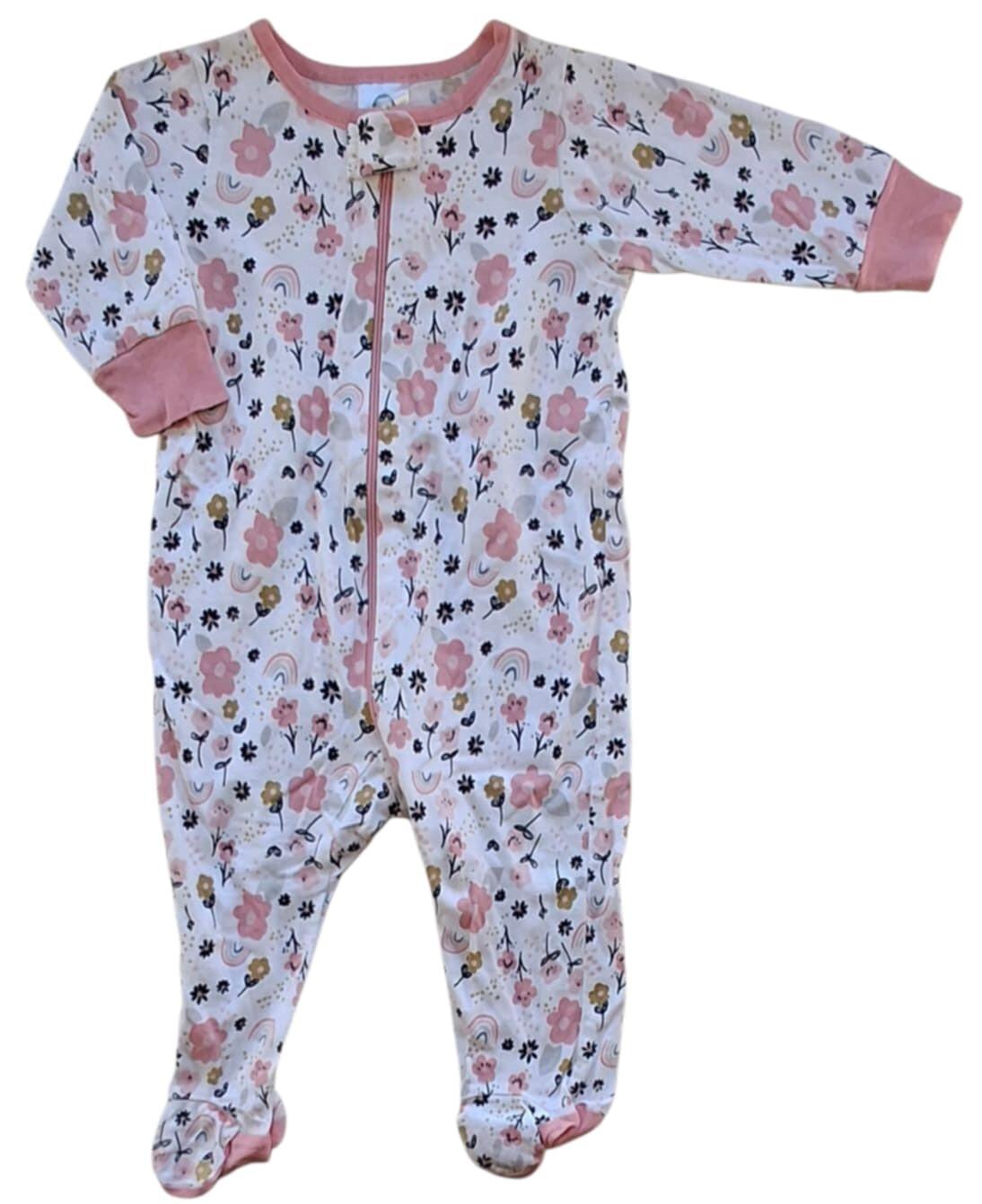 Gerber hvid langærmet blomstret natdragt str. 3-6 mdr med fødder, rosa kanter og med en lynlås fra hals til fod.