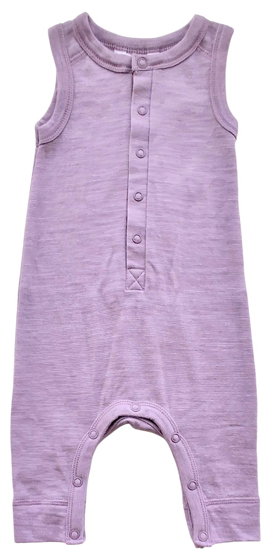 Joha lyslilla uld heldragt str. 56-62 uden ærmer og med trykknapper ned foran. 95% merinould, 5% polyamid.