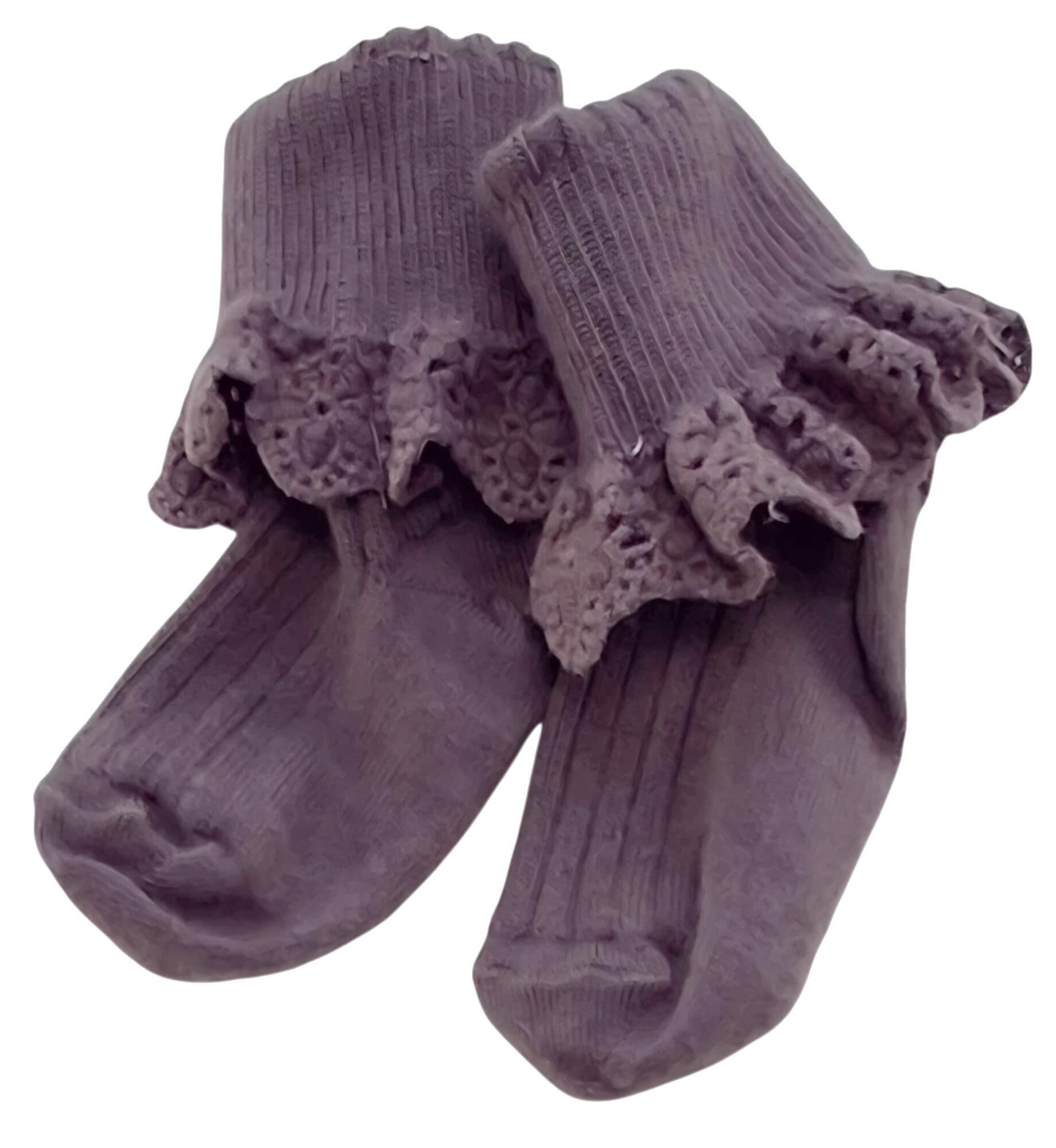 Lilla uld strømper med fine blonder str. 0-3 mdr