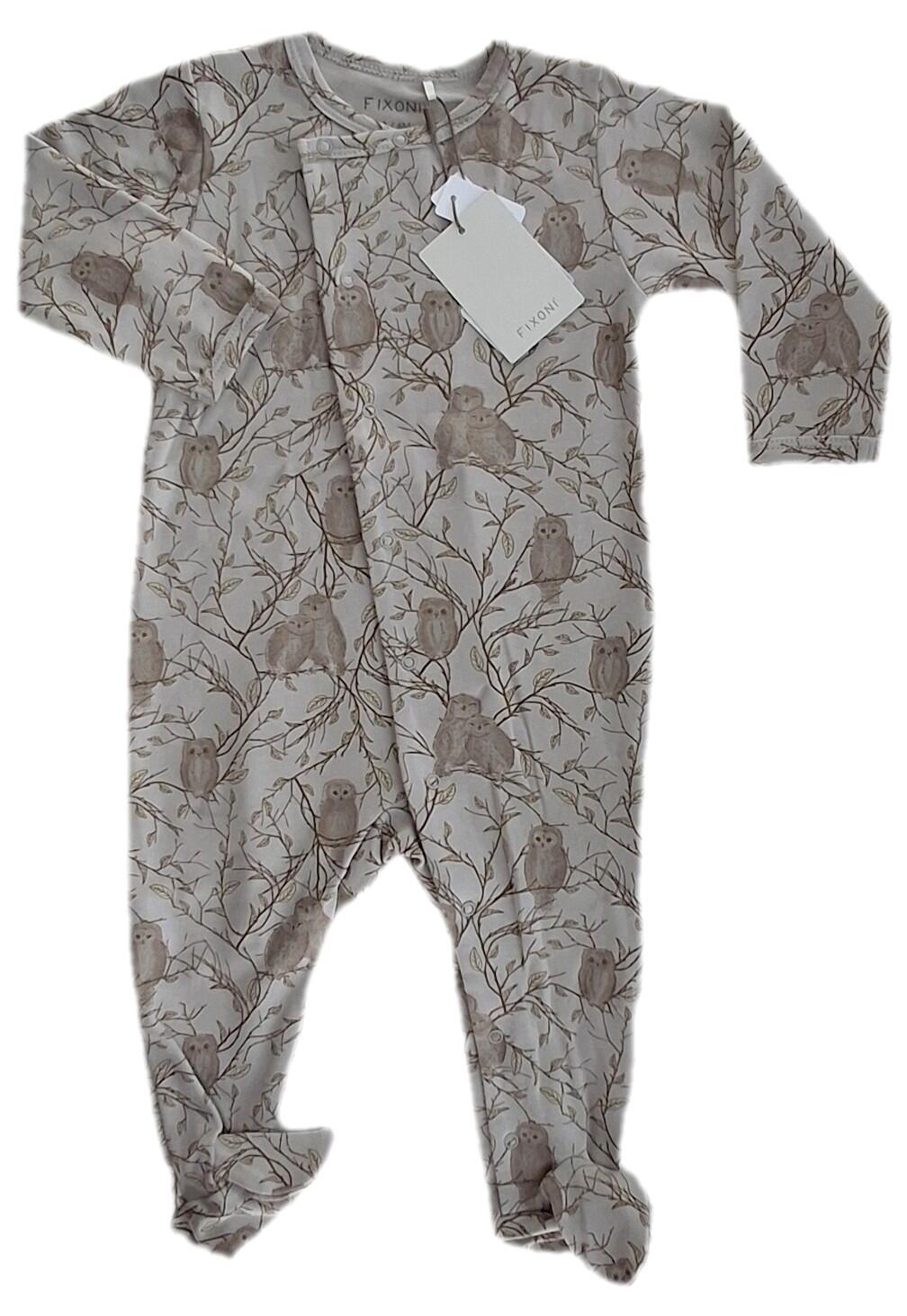 Ny Fixoni beige langærmet heldragt str. 68 med fødder, tryk af grene og ugler og med trykknapper fra hals til fod. 100% bomuld.