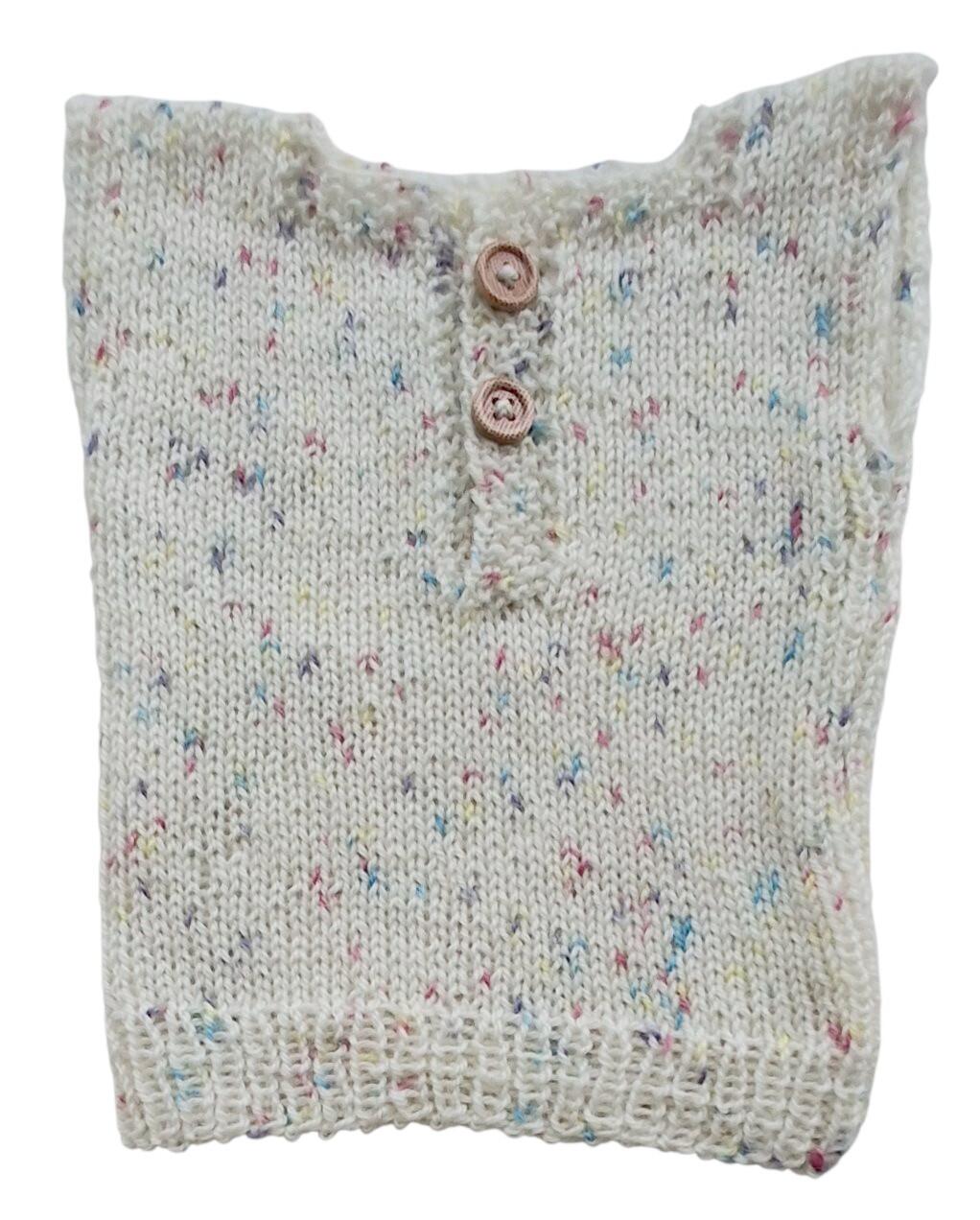 Ny hjemmestrikket råhvid uld vest str. 0-6 mdr med forskellige farvede nister i garnet og med to knapper i stolpelukning. !00% merinould.