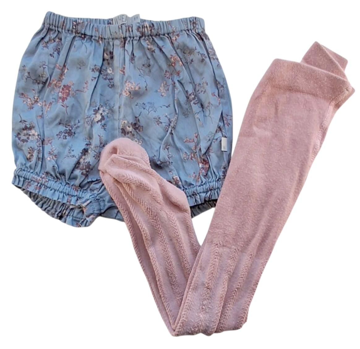 Wheat gråblå bloomers og rosa strømper str. 74. Bloomers har blomster over det hele, elastik i både talje og bukseben, og de rosa strømpebukser har et fint strikket mønster og er fra Coop.