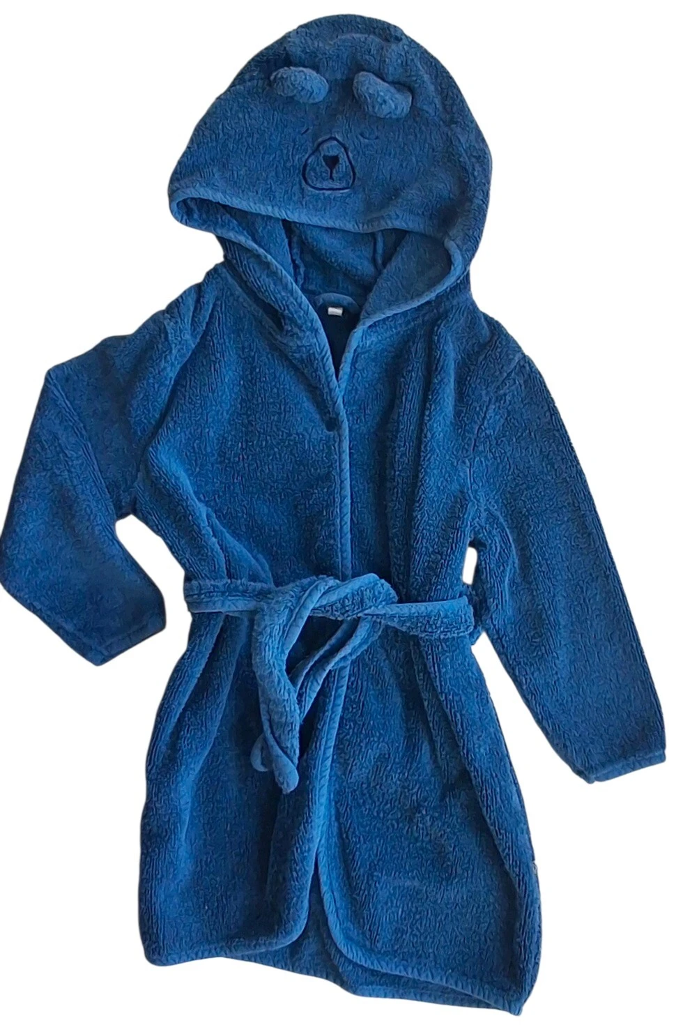 Pippi blå langærmet frotté morgenkåbe str. 98-104 med en hætte m. ører og bjørne ansigt, en trykknap og med en bælte i taljen.