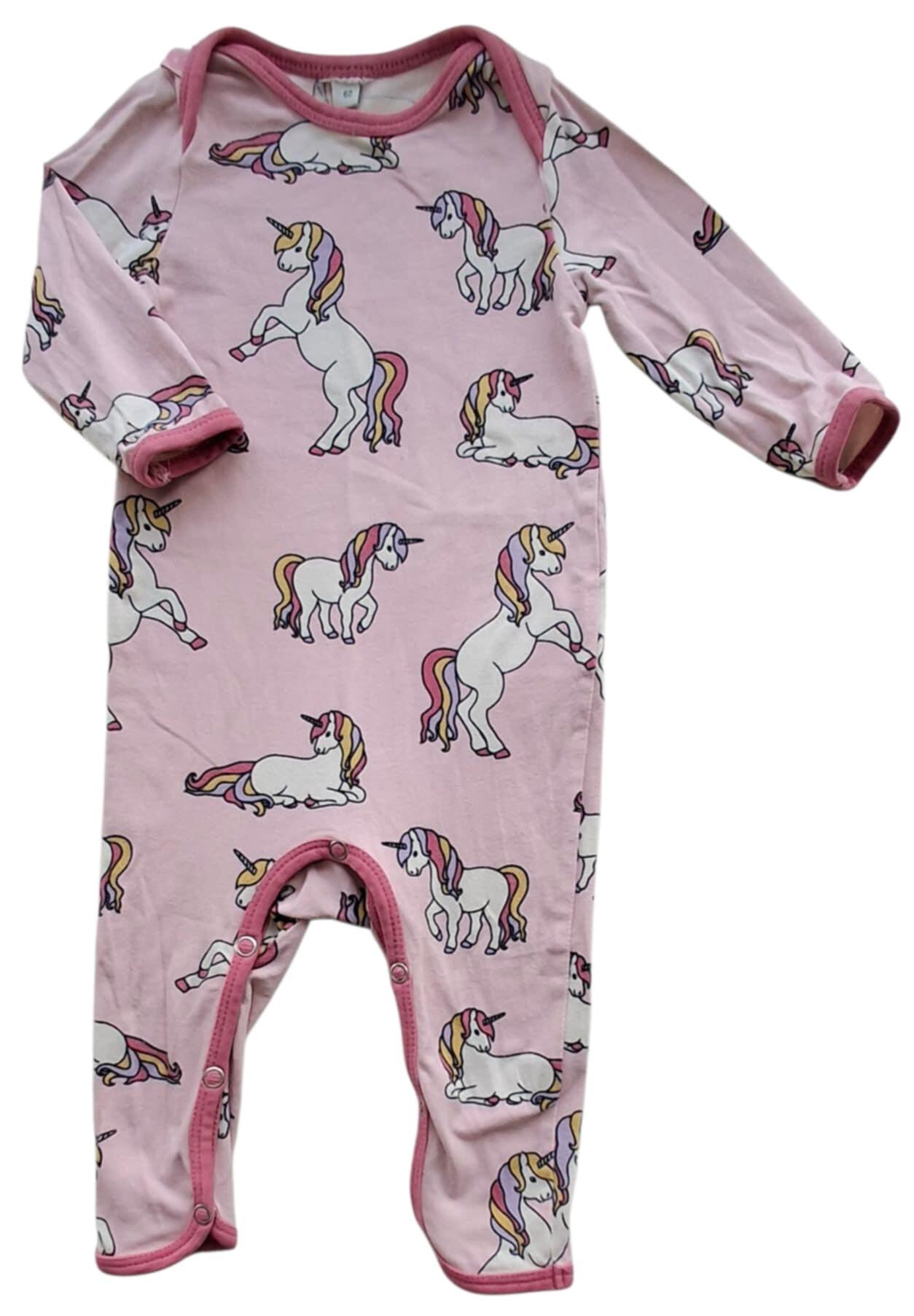 Småfolk lyserød langærmet heldragt str. 62 med tryk af enhjørninger og med mørk rosa kanter.