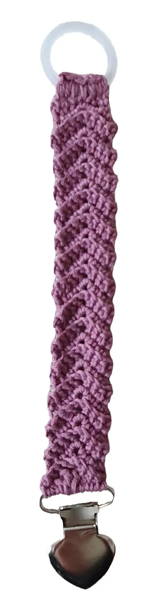 Nye hæklede V-suttekæder med en gennemsigtig ring og med en flot sølvfarvet hjerte clips. Kan også laves uden ring, og med en hæklet løkke i stedet for.