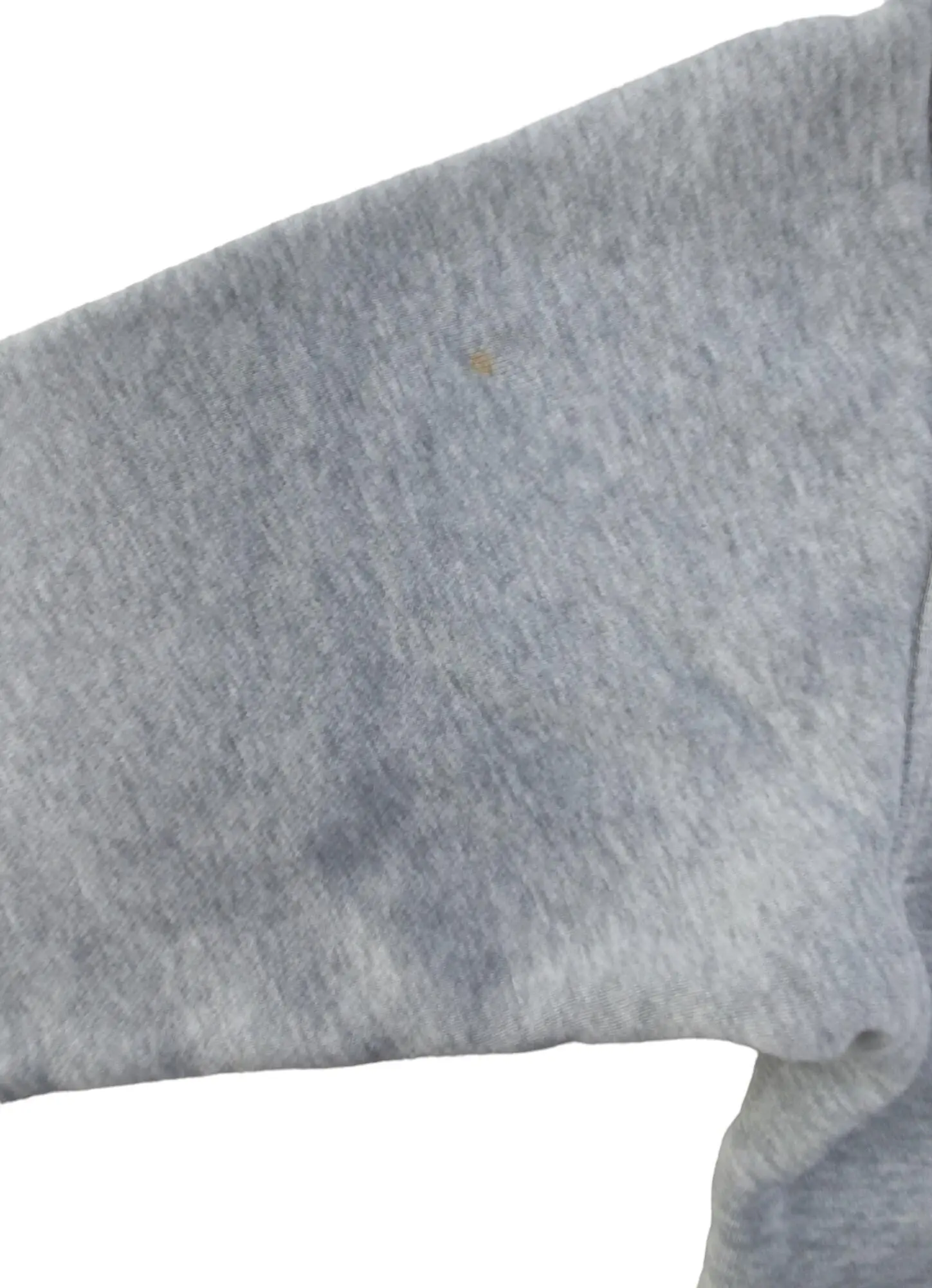 H&M lysegrå langærmet sweatshirt str. 110-116 med en hætte, lommer på forsiden, rib kanter og en lynlås ned foran. Obs svag orange-gul plet på det ene ærme, se billede.
