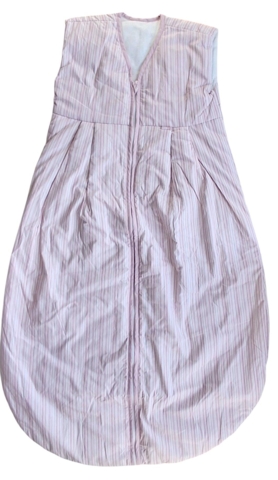 My Baby lyserød og hvidstribet sovepose med lang længde og god bredde, og med en lynlås hele vejen ned foran. Posen kan gøres mindre i længden med velcro på bagsiden. Stof: 100% bomuld og fyld: 100% polyester. Mål: 105 cm lang og 61 cm bred hvor den er breddes. Vaskes ved 40 grader.
