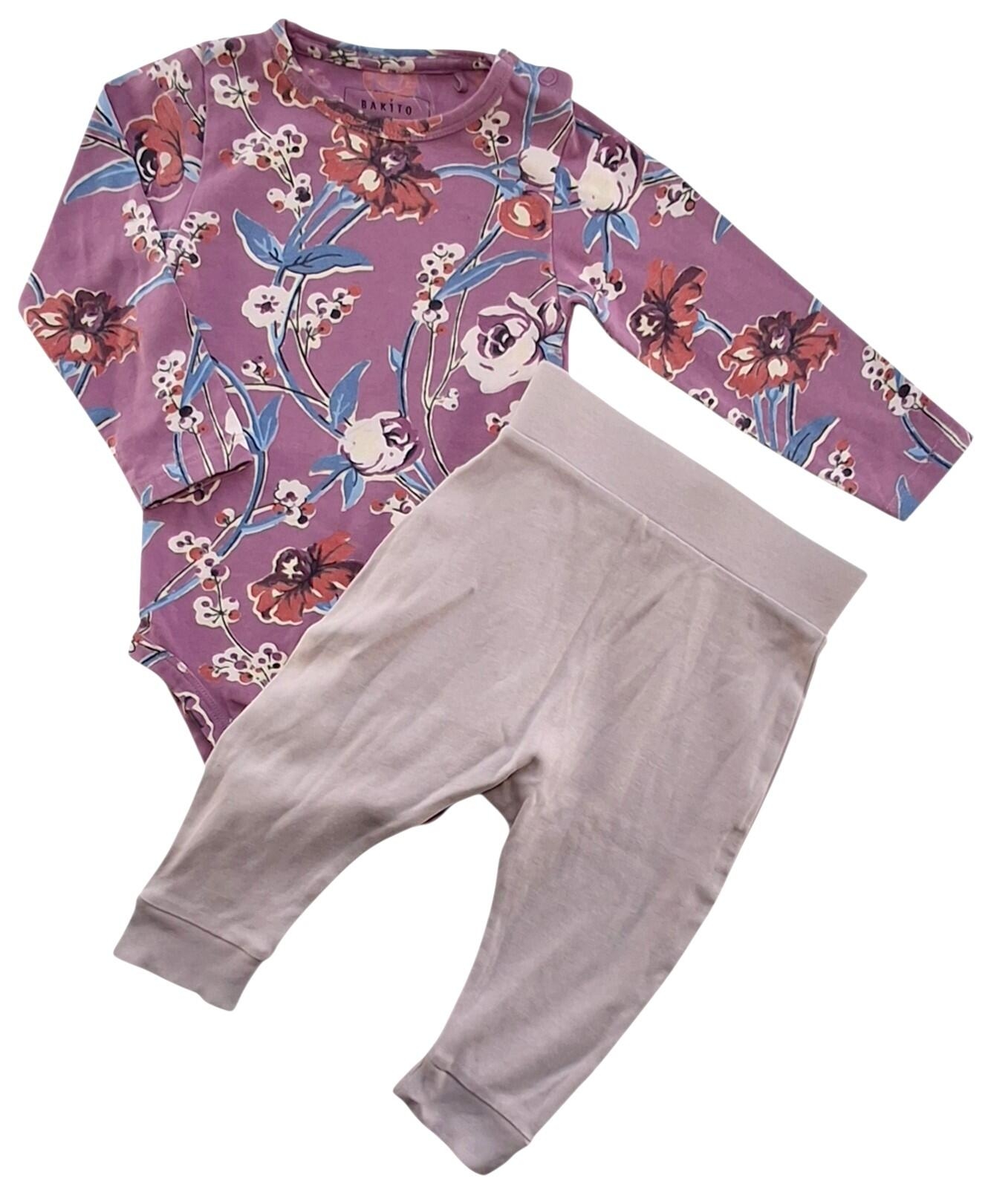 Bakito rødlilla body og Smallstuff bukser str. 74. Bodyen er blomstret og har lange ærmer, og to trykknapper på skulderen. Bukserne er pudderfarvede  og med elastik i taljen.