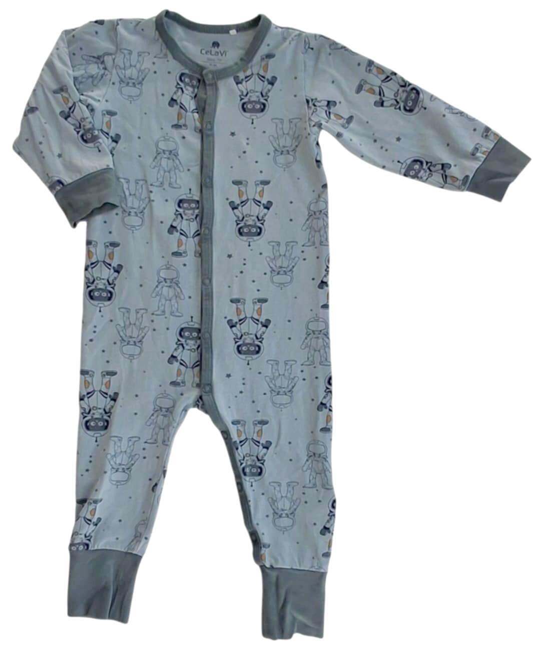 Celavi grågrøn langærmet heldragt str. 70 med tryk af rummænd og med trykknapper fra hals til fod.