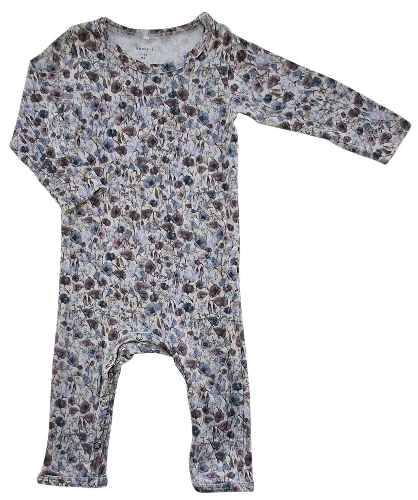 Name it beige småblomstret heldragt str. 62 i en blød kvalitet og med to trykknapper på skulderen.