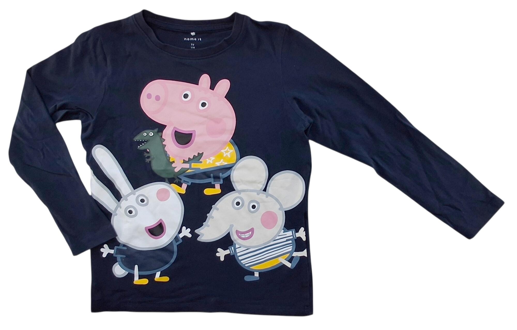 Name it mørkeblå langærmet bluse str. 110 med et stort tryk fra børneserien "Gurli Gris" og med rib i halsudskæringen.