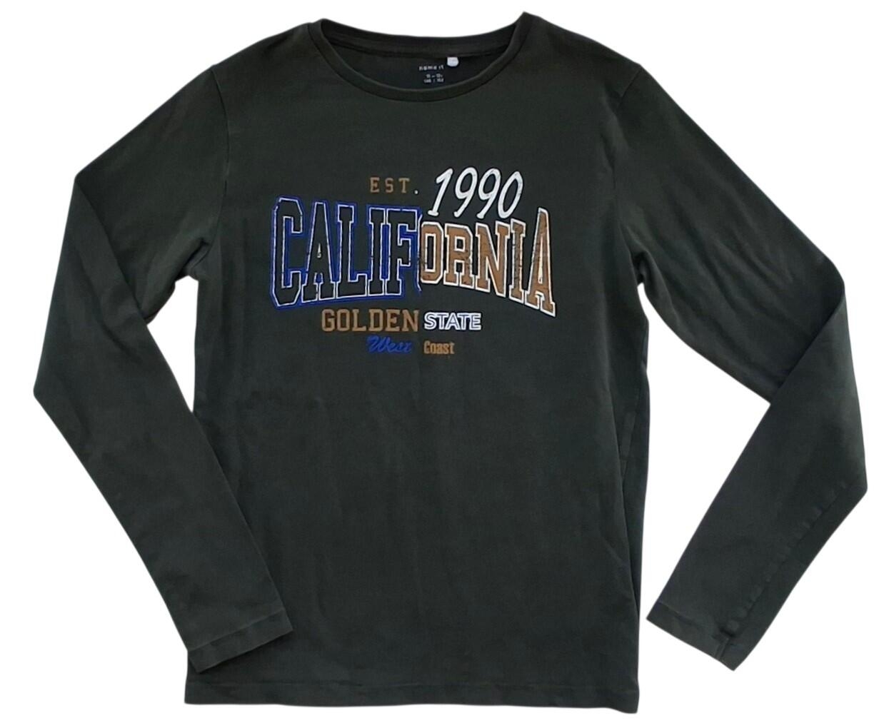 Name it mørkegrøn langærmet bluse str. 146-152 med et fint tryk på forsiden, og med en rund halsudskæring. 95% bomuld, 5% elastane.