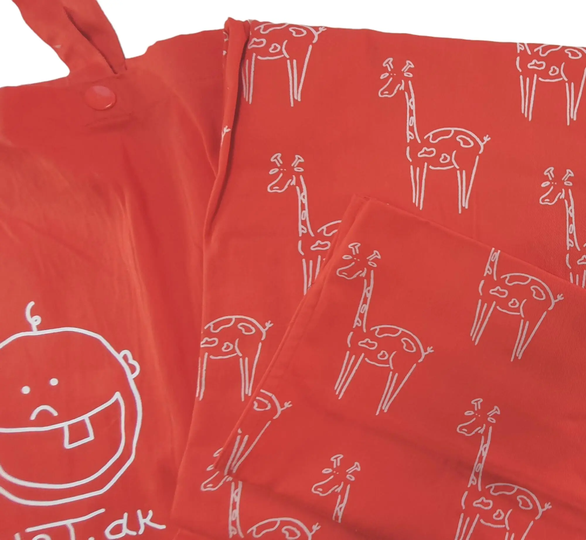 Nyt idaT tomatrød babysengesæt i en flot farve med cremefarvede giraffer og bindebånd. Der medfølger en mulepose i samme farve. Str. 100x70