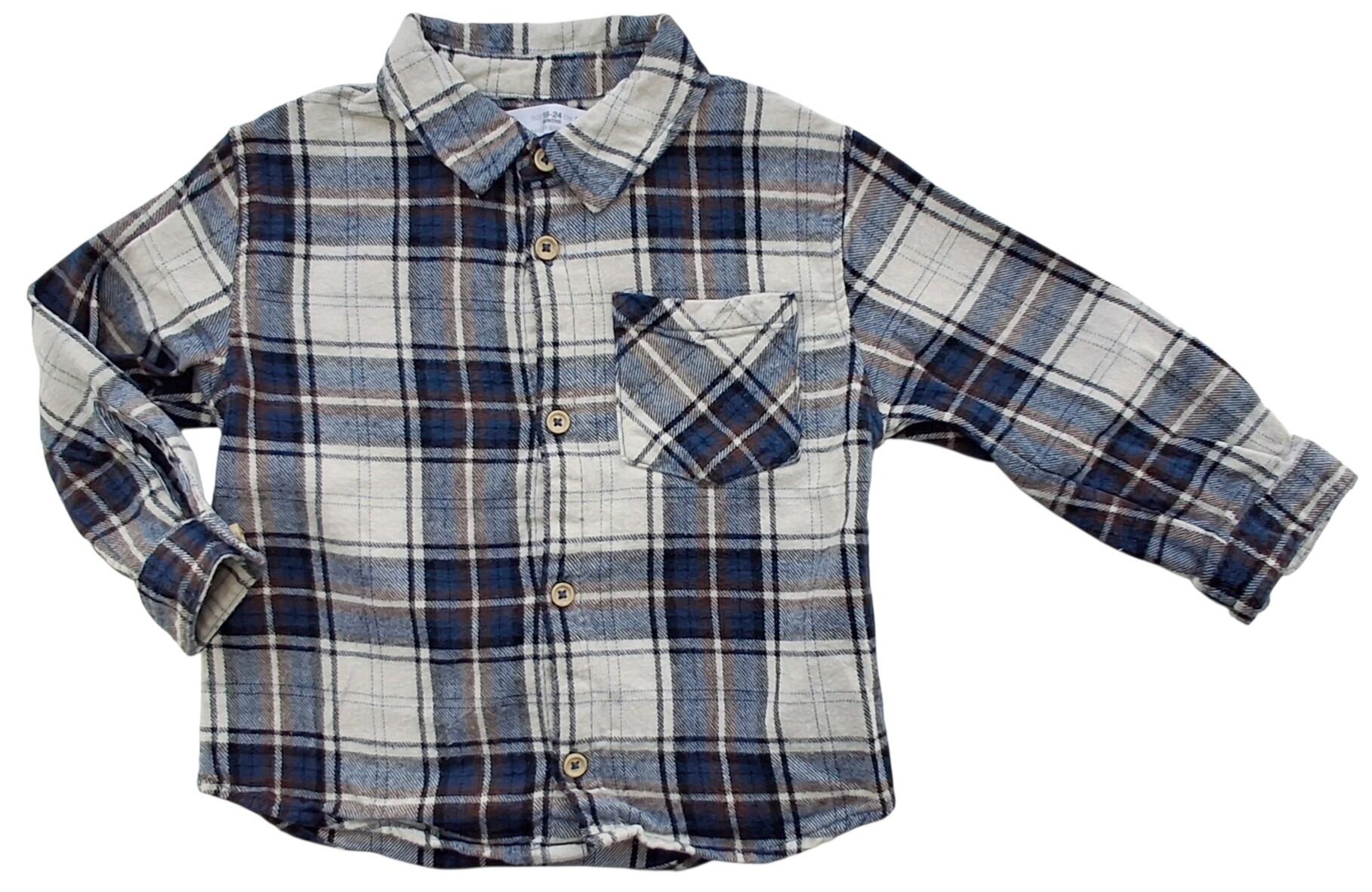 Zara råhvid og blåternet langærmet skjorte str. 92 i et blødt og kraftigt materiale, krave, brystlomme og med knapper ned foran. 100% bomuld.