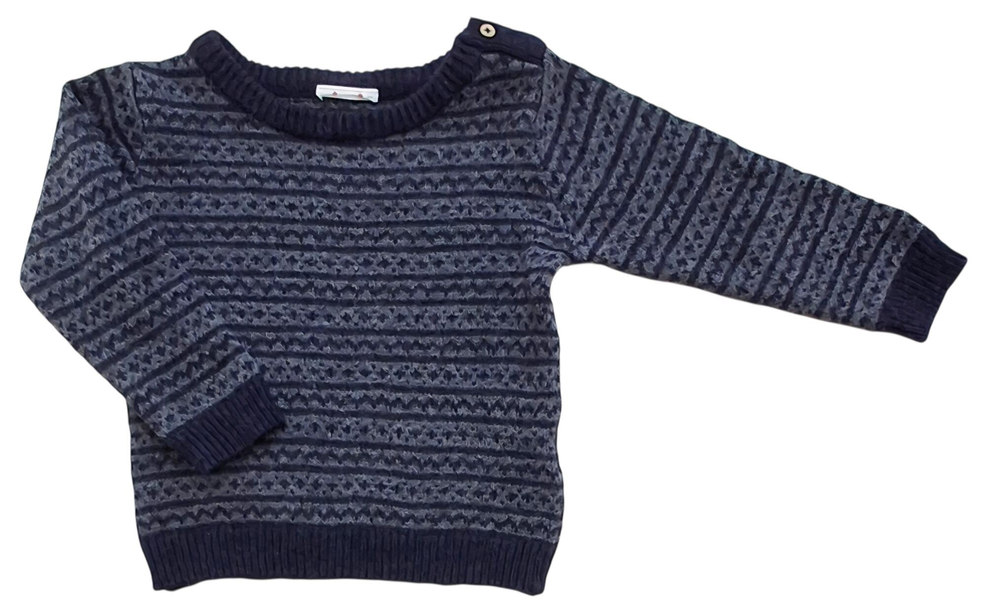 Friends grå langærmet uld striktrøje str. 86 med et mørkeblåt mønster, mørkeblå rib kanter og to knapper på skulderen. 60% bomuld, 30% nylon og 10% uld.