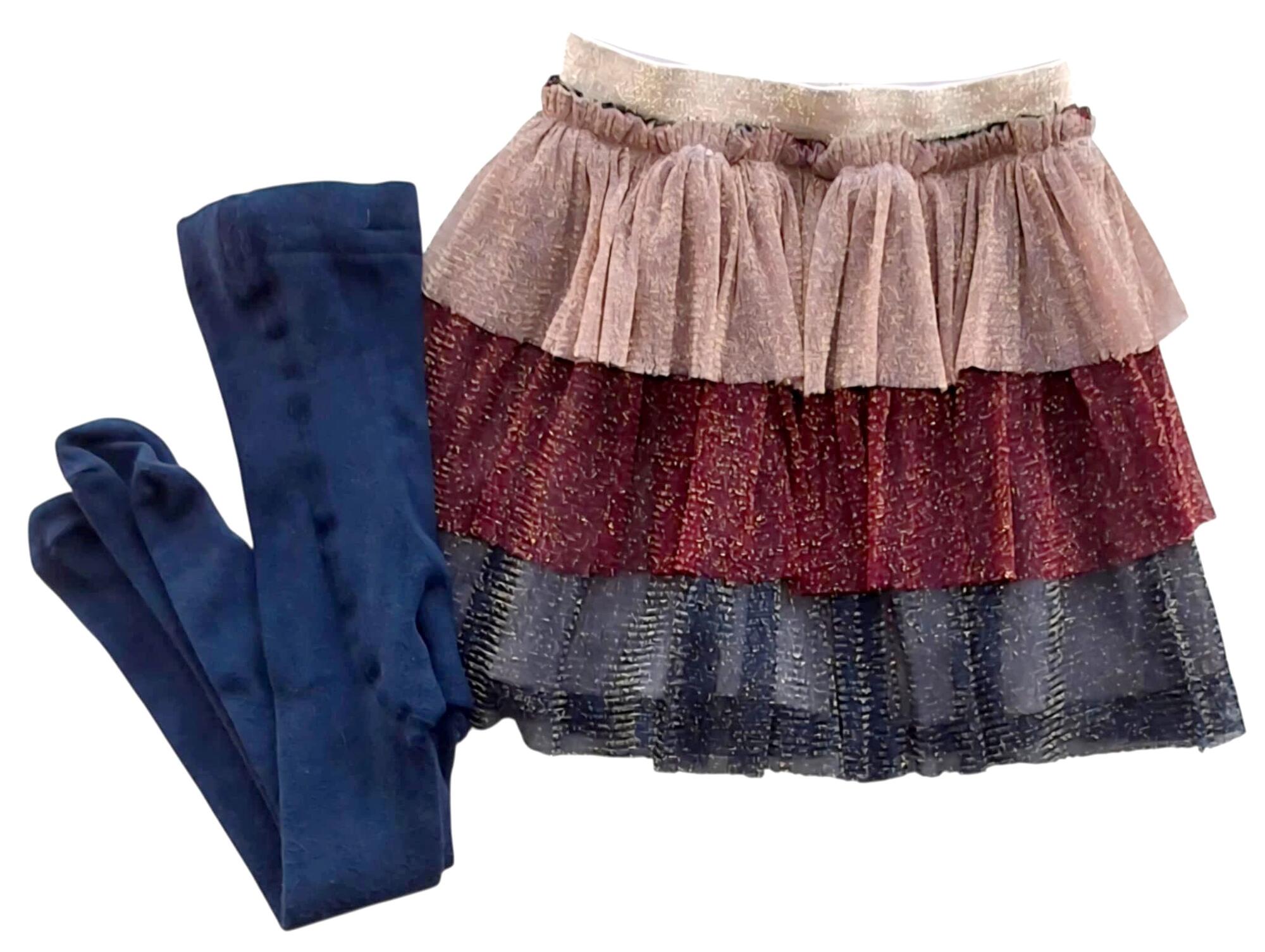 VRS nederdel og mørkeblå strømpebukser str. 80. nederdelen har tre etager i forskellige farver med guldtråd indvævet i stoffet, og med en fin elastik i taljen. Strømpebukserne er mørkeblå med fødder og af ukendt mærke.